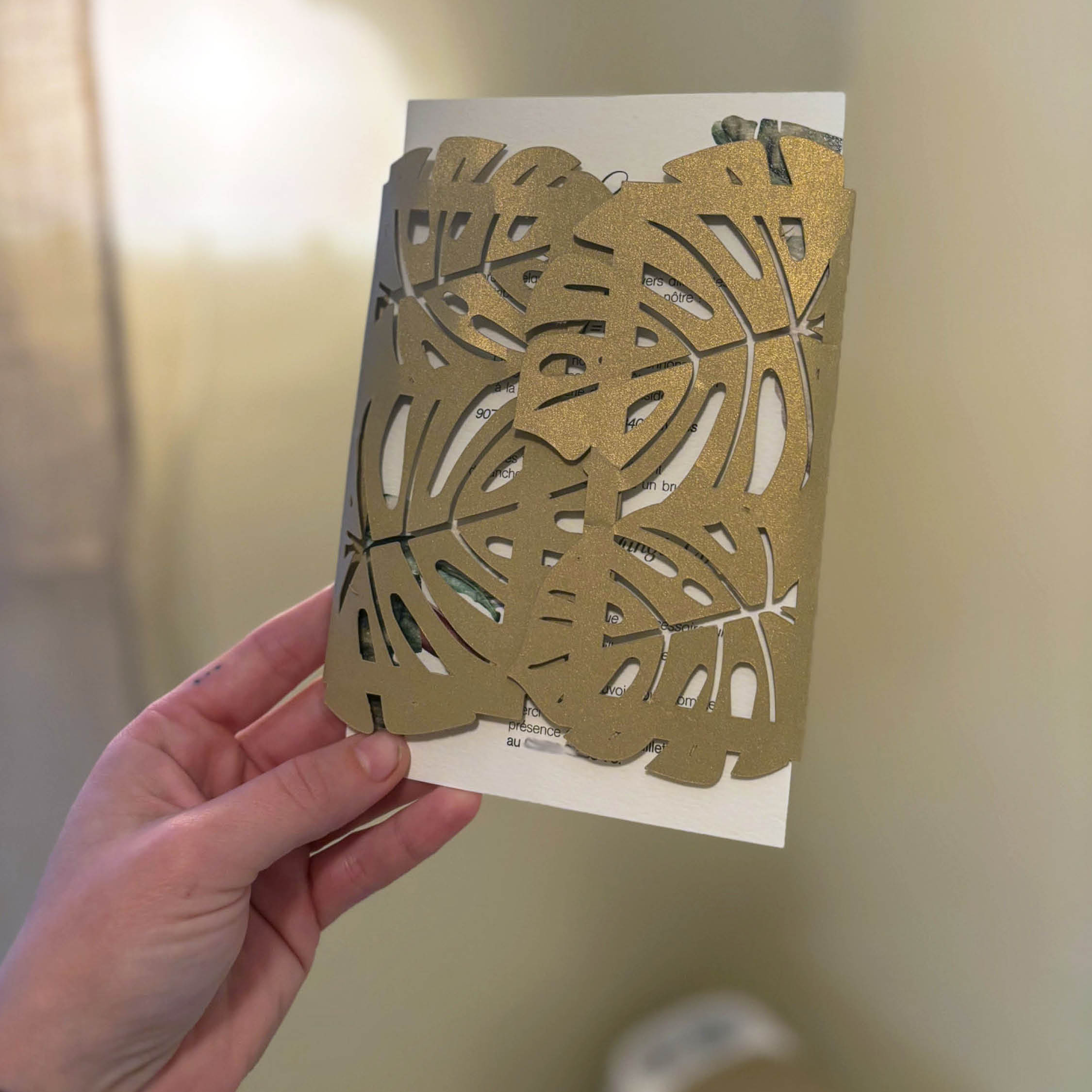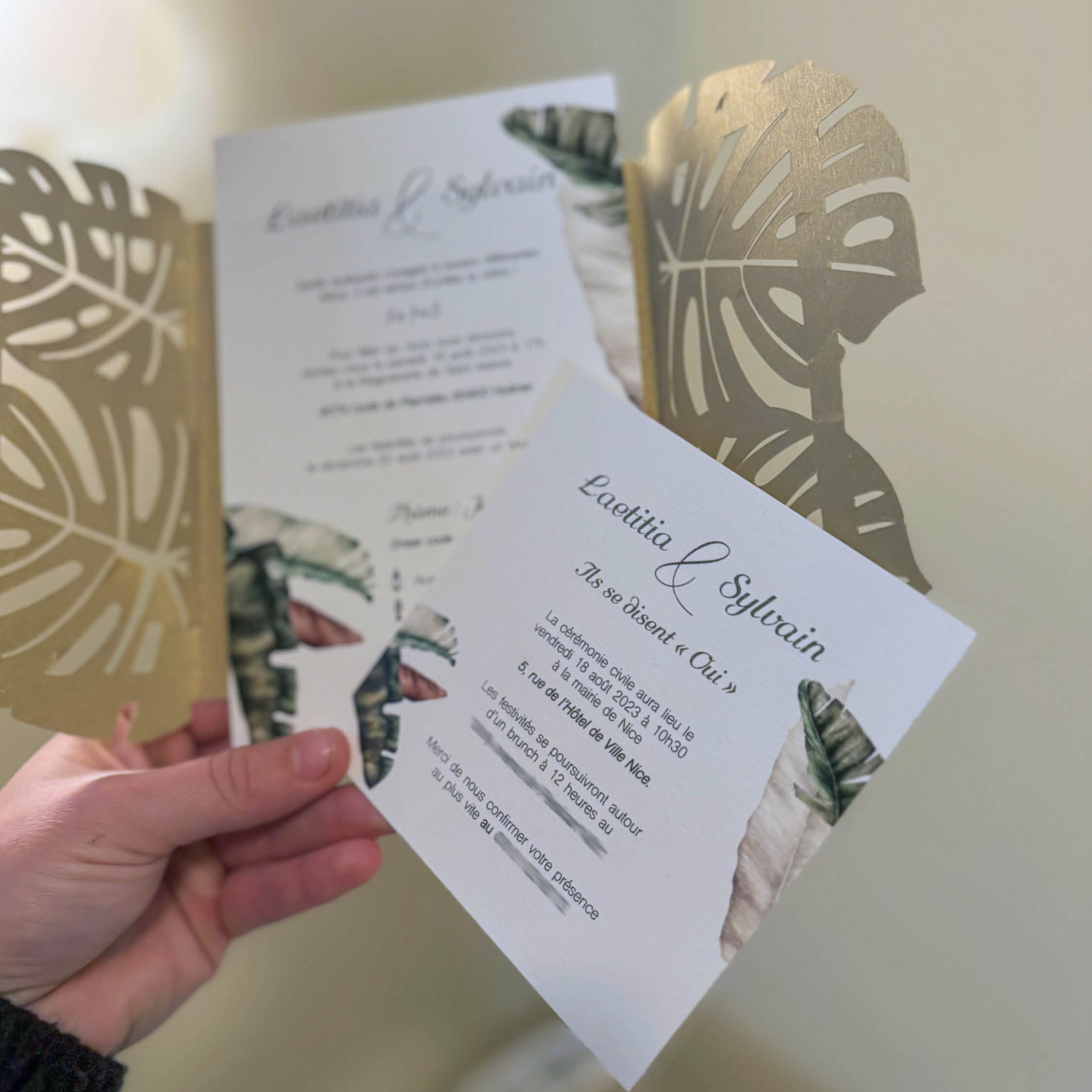 J’ai imaginé une découpe en feuille de monstera pour évoquer subtilement la jungle, associée à un papier satiné doré, soigneusement sélectionné.